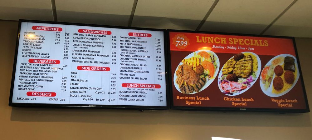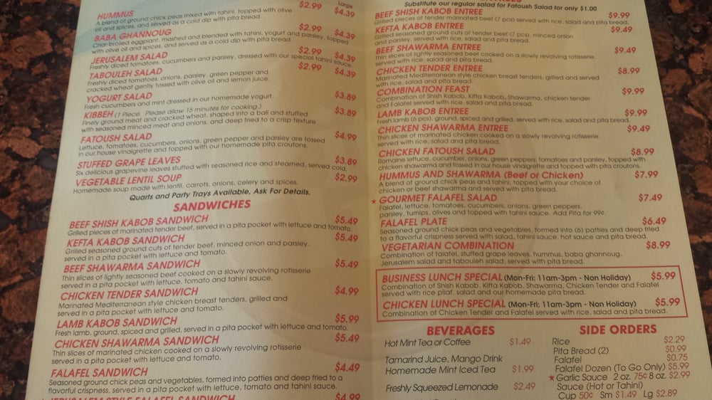 Our new Manager's Lunch Combo includes Kefta Kabob, Chicken Shawarma, Falafel, Rice, Fatoush Salad, Hummus, Pita Bread and your choice of Beverage.